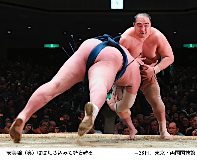 安美錦に勢は、安美錦がはたき込みで勝ちました。