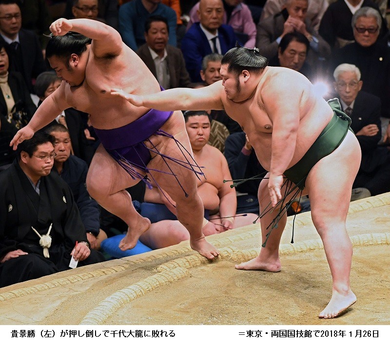 貴景勝に千代大龍は、千代大龍が押し倒し。