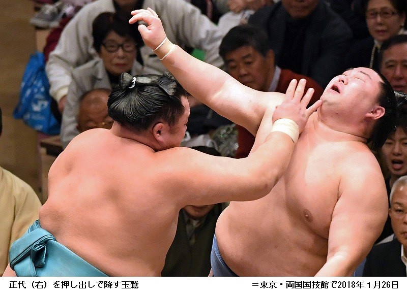 正代に玉鷲は、玉鷲が押し出しで勝ちました。