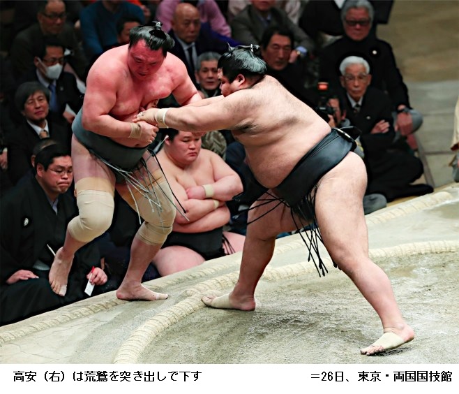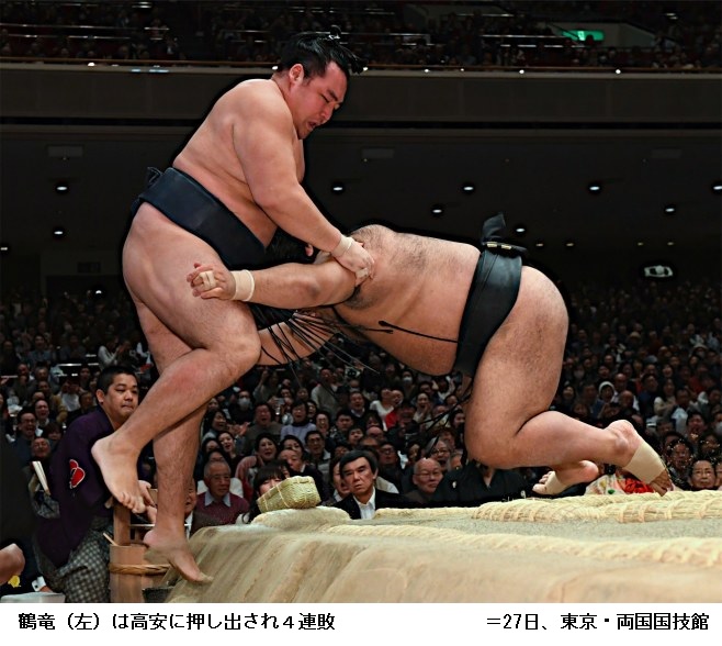 横綱 鶴竜に大関 高安は、高安が押し出し。高安は11勝目。鶴竜は初日から10連勝のあと4連敗です。