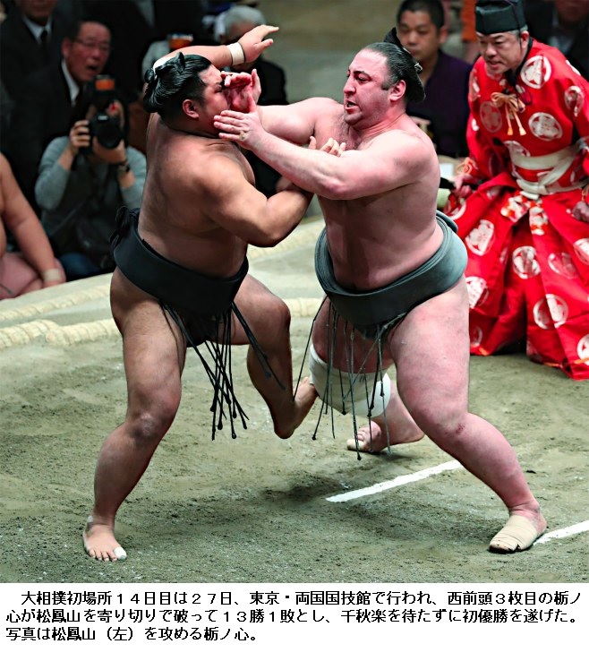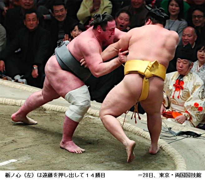 遠藤に栃ノ心は栃ノ心が押し出し。27日、初めての優勝を決めた栃ノ心が勝って、14勝1敗としました。栃ノ心は殊勲賞と技能賞を受賞しました。