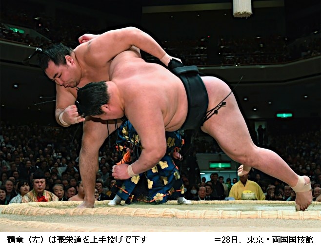 横綱・鶴竜に大関・豪栄道は鶴竜が上手投げ。鶴竜は連敗を4で止めて11勝4敗でした。豪栄道は8勝7敗でした。