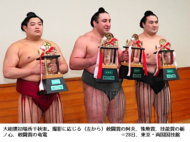 新入幕で敢闘賞の竜電は「今場所は攻める相撲が取れた。課題は力強さ。もっと稽古して強くなりたい。まだ始まったばかり」と三賞受賞にも気持ちを引き締めていました。