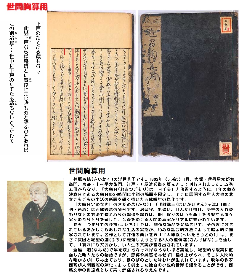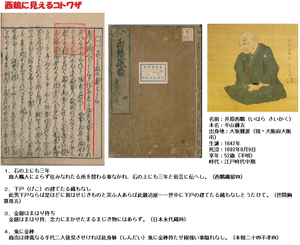 庶民階級の生活表現であるコトワザが表面に出てきたことは、とりもなおさず庶民の時代になってきたことの証ででもあります。金と色と女を描いて並ぶことの者のない井原西鶴の浮世草子には訳300のコトワザが用いられているということですが、これも浮世草子の性格につながるものです。いわゆる町人物といわれる作品類にはコトワザが多く、次に西鶴の作品から二、三拾ってみました。