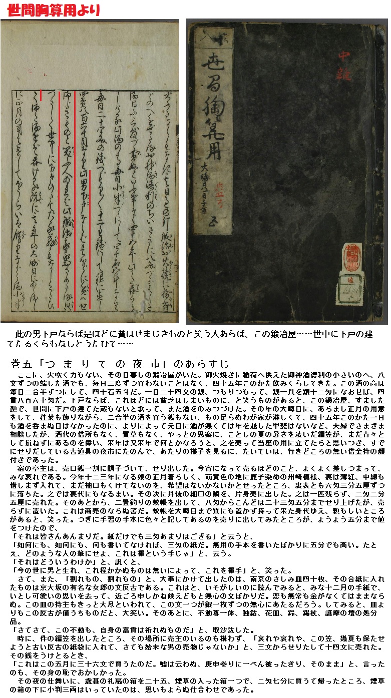 この時代はちょっとした工夫――例えば懐炉灰の発見――によっても金儲けは出来たので、〈果報は寝て待つ〉てもよかったわけです。案じなくてもやがては金に恵まれることもあったのです。〈金〉に関するコトワザは多く〈金が敵、金が金をもうける、木は木銀(かね)は銀、地獄の沙汰も金次第〉など数々あらわれています。大阪の流行語チョロマカスがはやった時代です。がめつい人間どもがうようよしていたわけです。〈死がな目くじろ(死ンダラ目玉まデクリヌク)〉、〈爪に火をともす(最高ノケチン坊)〉という状態であり、ついには〈鰯の頭も信心心〉となるのです。