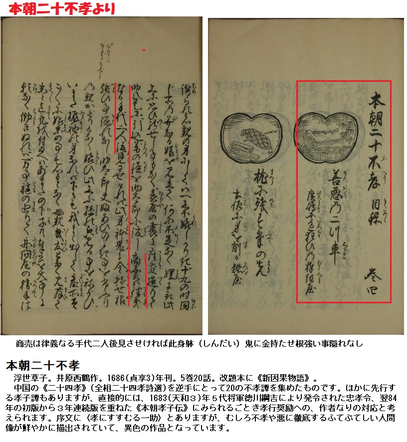 図版の四つの例は、近世町人階級の抬頭とその富を理解せずには真の意味を汲み取ることは難しいようです。いずれも現代にまで続いていることは暗示的でもあります。封建時代は、多くの点で〈忍(しのぶ)〉の一字が重んじられました。世間の冷たさは言うまでもなく、やっとかちえた職場も、決して百%居心地のいいものではありません。石のように堅くて冷たいのです。しかし、ここで短気を起こすと、それこそ〈短気は損気〉というわけで、あたら一生を台無しにしてしまうのです。