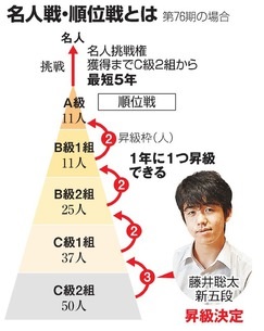 ログイン前の続き今期のC級2組には50人が参加。五つあるクラスの中で最多で、それぞれ1年弱をかけて10局戦い、成績上位3人が昇級できる。初参加となる1期での昇級は容易ではない。中学生棋士では、羽生善治竜王(47)と谷川浩司九段(55)は2期、渡辺明棋王(33)は3期かかった。現在、頂点に立つ佐藤天彦名人(30)は4期在籍した。