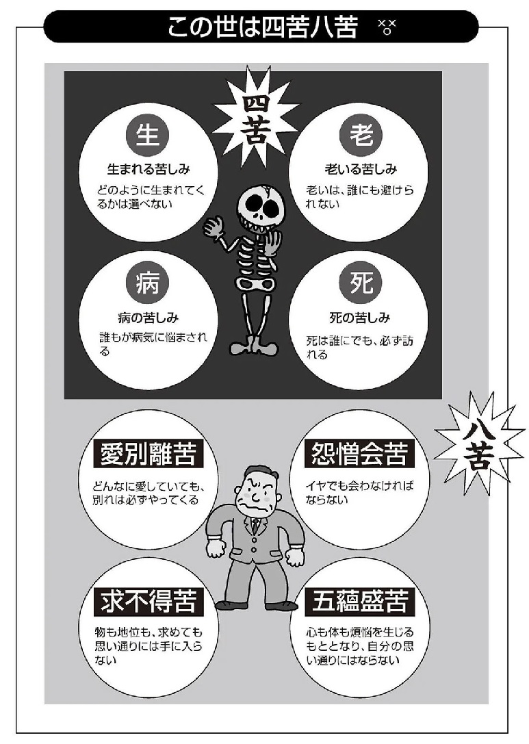 求不得苦(ぐふとっく)(求めても得られない事を求めてしまう欲から生じる苦しみ)、