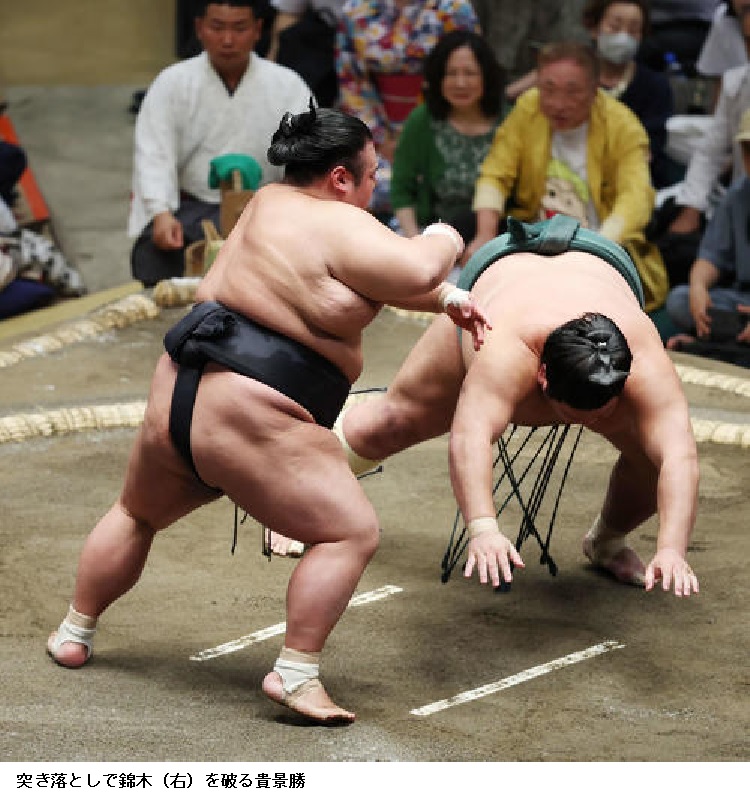 184キロを1発ではじき飛ばす、貴景勝の力強い立ち合いが戻ってきた。距離を詰めたい錦木を二の矢、三の矢で突き放した。最後は左から、相手を根こそぎ引っ張り込むような突き落とし。同体取り直しで敗れた初日北勝富士戦の2番、この日の取組と、いずれも足運びはスムーズ。先場所全休を招いた、両膝の負傷を感じさせなかった。「100点満点の相撲なんてない。力を出し切るだけだった」。堂々とした話しぶりが、状態の良さを物語る。