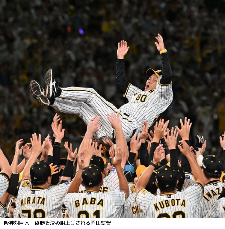 「岡田コール」の中、甲子園の夜空に向かって笑顔で宙を舞った。6回だったのは球団6度目の優勝を意味した。最後は11連勝の独走。「まさかこんな9月に強くなると思わなかったので、ちょっと勝ち過ぎましたね」とドヤ顔で虎党を沸かせた。