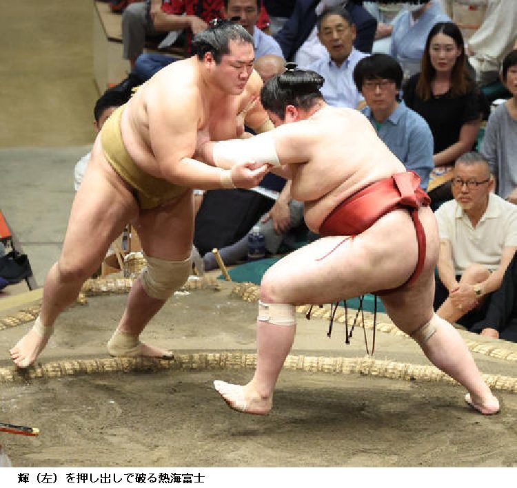 【若乃花の目】前傾を崩さない熱海富士 一生懸命さが伝わるのが好感を持てます ―― 前日は取り直しの2番を取った熱海富士が、この日も前傾を崩さない、一生懸命な相撲で1敗をキープしました。相手の輝は器用ではないけど当たりが強い。そこをどう対処するかがポイントでしたが、立ち合いできちんと当たったのが勝因です。後は流れのまま、押されても回り込んで冷静に対応し、すぐに押し返しての完勝でした。