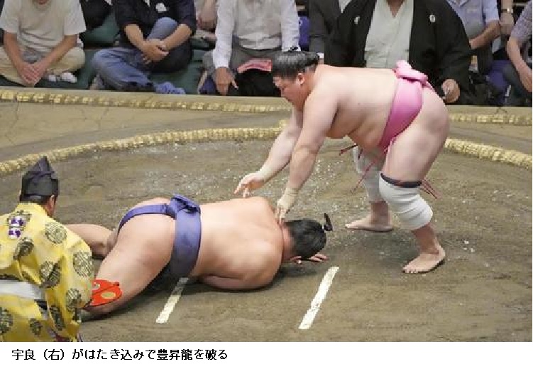 取組前まで1敗は2人。もう1人の1敗、東前頭15枚目の熱海富士との直接対決で押し倒された。相手は今場所出場している幕内力士で最年少の21歳。5場所ぶりの返り入幕で、幕内2場所目の新鋭との初顔合わせに敗れ、悲願の初優勝に向けて1差を負う展開となった。