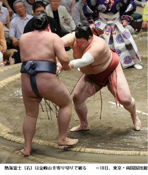 11日目は関脇大栄翔戦が組まれた。好成績のため、今後は三役以上との対戦が増えると予想され、終盤戦の5日間は試練の連続が予想される。それだけに、勢いで星を伸ばしてきたとはいえ、幕内優勝の重みを知らない、自身よりも番付が低い熱海富士相手に、勝ちきりたかったが敗れた。