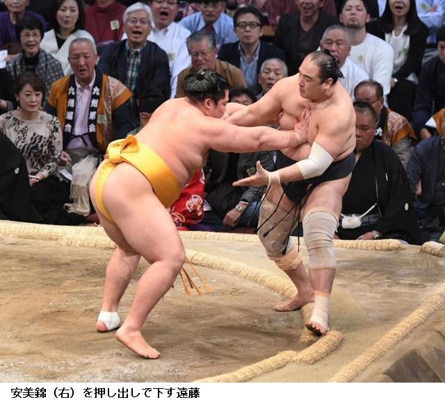 安美錦に遠藤は、遠藤が押し出し。安美錦は2敗目です。
