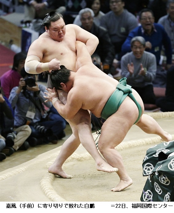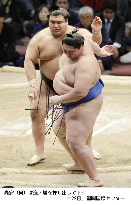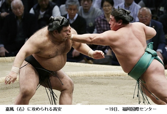 大関・高安に嘉風は、嘉風が突き落とし。高安は3敗目を喫しました。