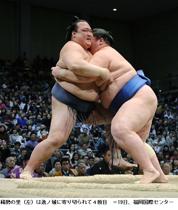 逸ノ城に横綱・稀勢の里は、逸ノ城が寄り切り。稀勢の里は連敗で4敗目です。
