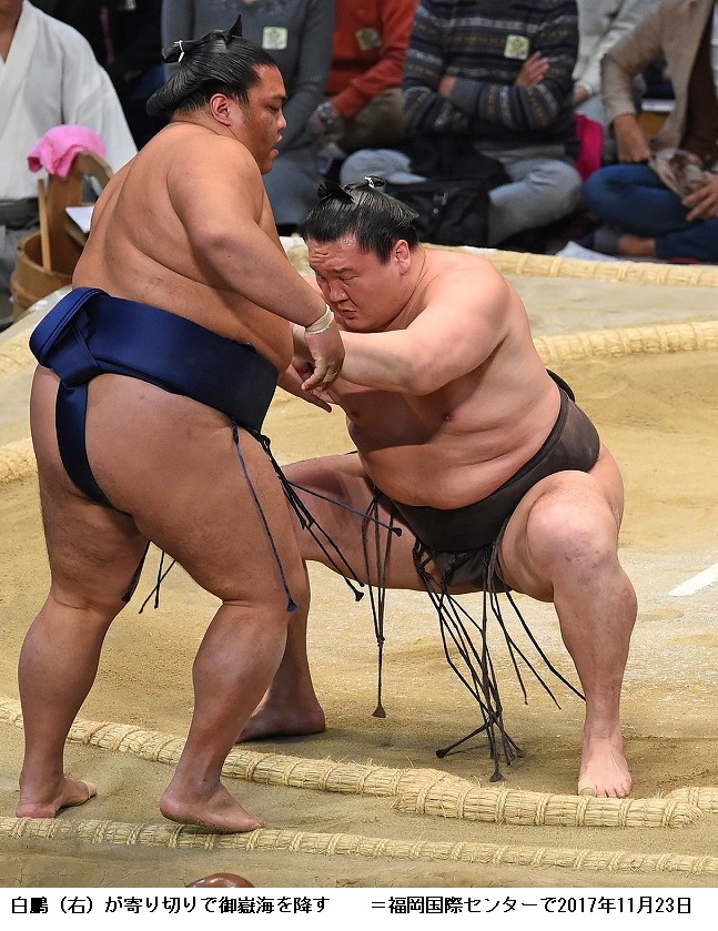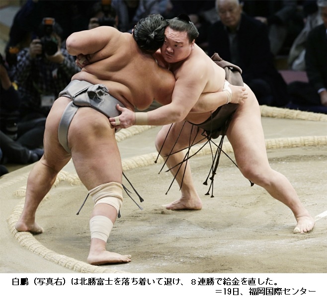 九州場所の優勝争いは、1敗の白鵬を星1つの差で平幕の北勝富士と隠岐の海が追う展開です。