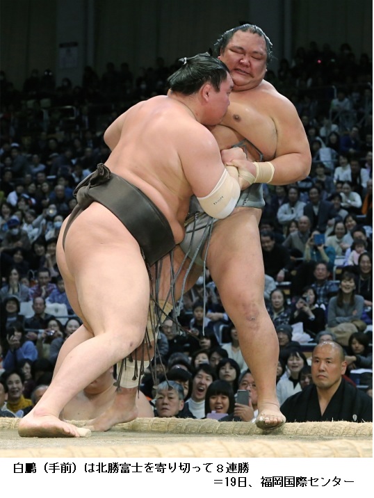 横綱・白鵬に北勝富士は、白鵬が寄り切りで勝ちました。ただ1人勝ちっぱなしの白鵬は19日もあぶなげない相撲で北勝富士を破り、8連勝で勝ち越しを決めました。
