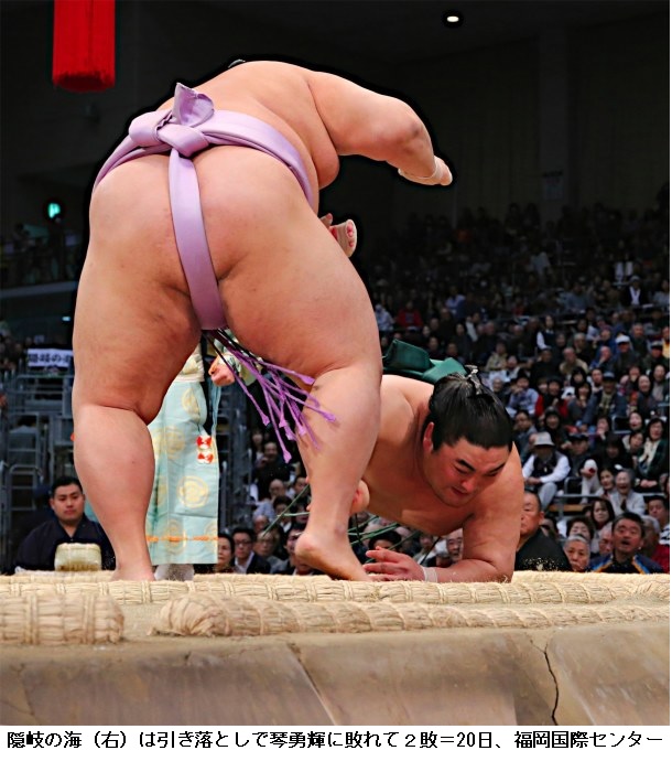 隠岐の海に琴勇輝は琴勇輝が引き落としで勝ちました。隠岐の海の2日目からの連勝は7で止まりました。