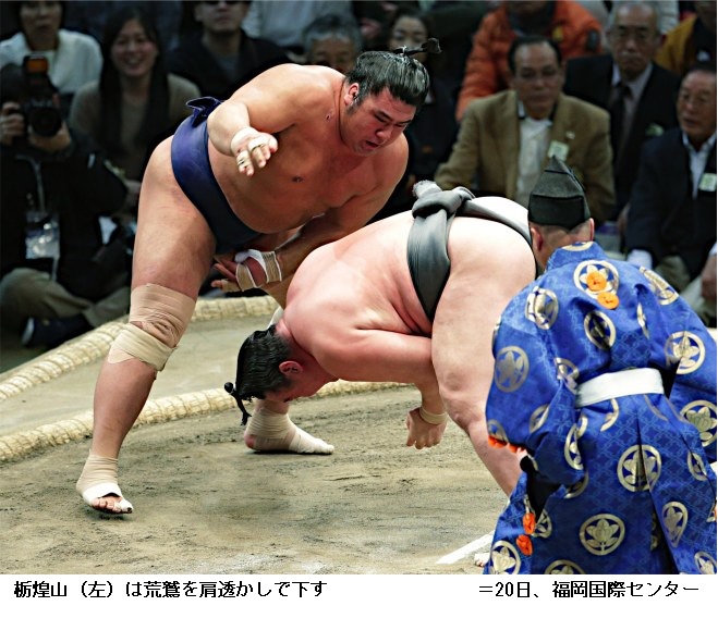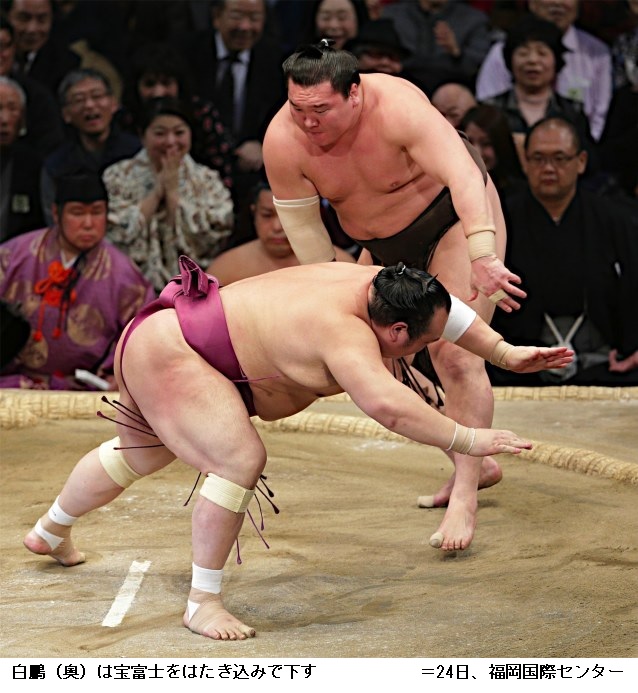宝富士に横綱・白鵬は、白鵬がはたき込み。白鵬は1敗を守りました。