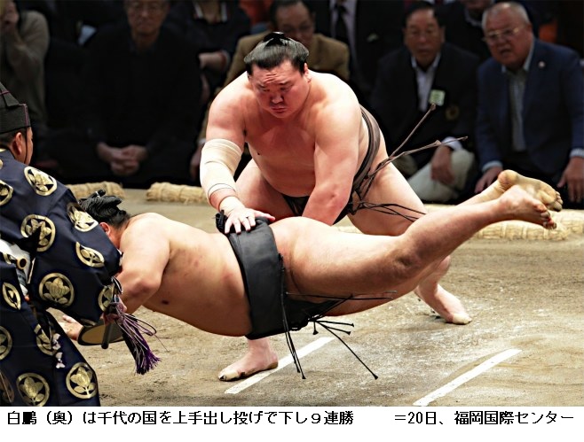 千代の国に横綱・白鵬は白鵬が上手出し投げ。白鵬は初日からただ1人、9連勝です。