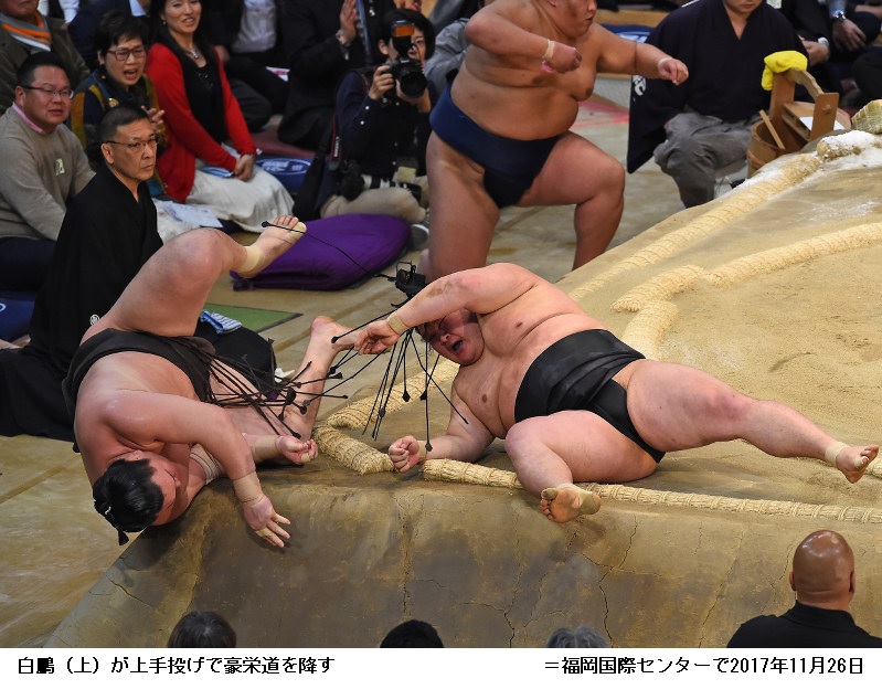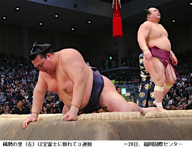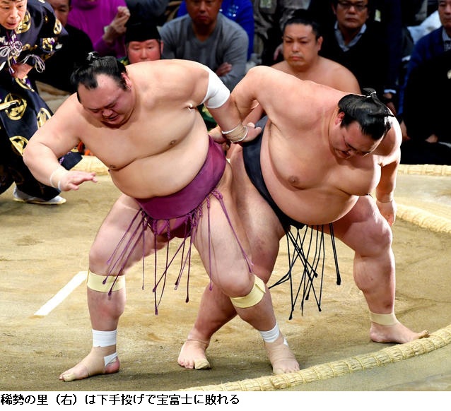 横綱・稀勢の里に宝富士は宝富士が下手投げ。稀勢の里は3連敗で5敗目を喫しました。