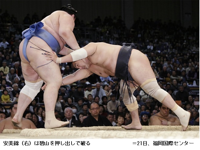 安美錦に碧山は安美錦が押し出しで勝ちました。