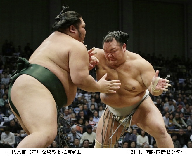 北勝富士に千代大龍は北勝富士が押し出し。北勝富士は勝ち越しを決めました。
