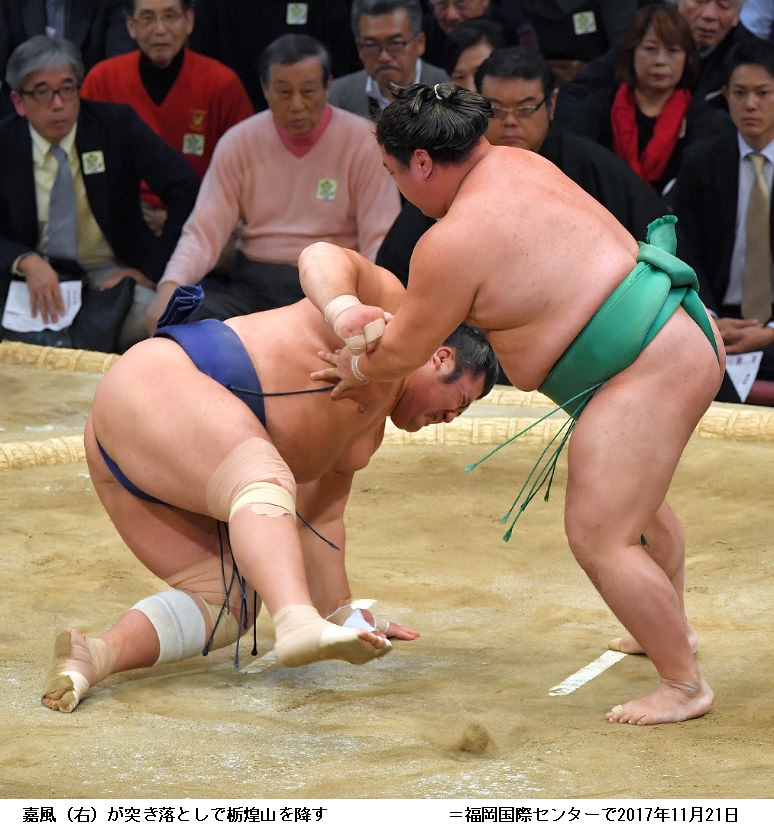 御嶽海に嘉風は、御嶽海が引き落とし。