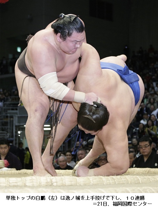 横綱・白鵬に逸ノ城は白鵬が上手投げ。ただ1人、勝ちっぱなしの白鵬が21日も危なげない相撲で逸ノ城を破り、初日から10連勝としました。逸ノ城は3敗目です。