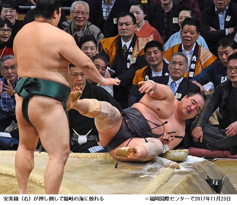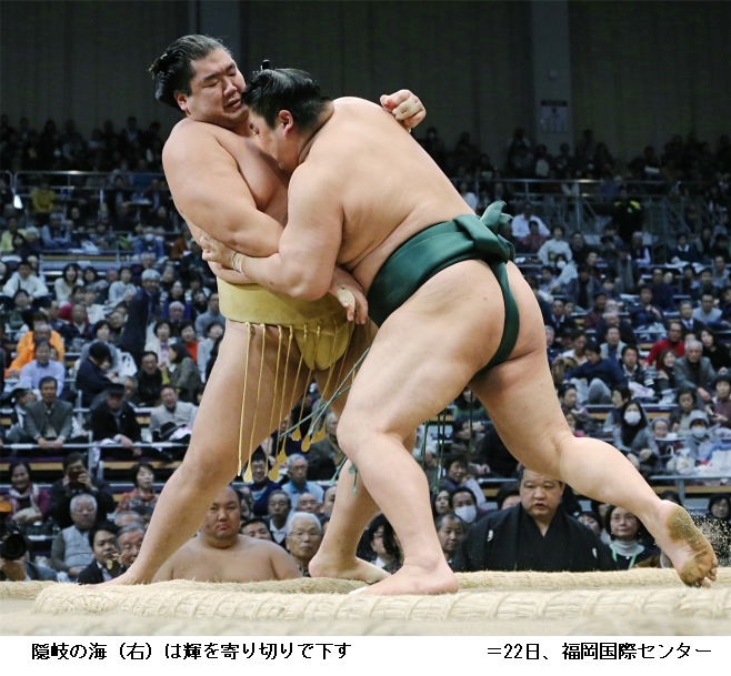 安美錦に隠岐の海は、隠岐の海が押し倒しで勝ちました。隠岐の海は2敗を守り、⑽勝目です。