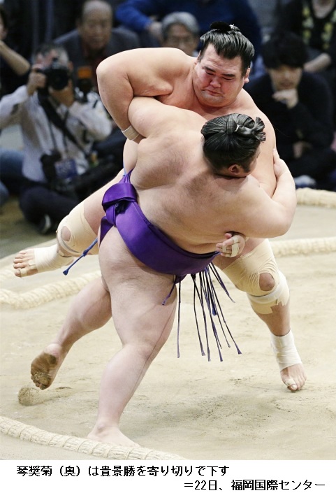 松鳳山に琴奨菊は琴奨菊が押し出しで勝ちました。