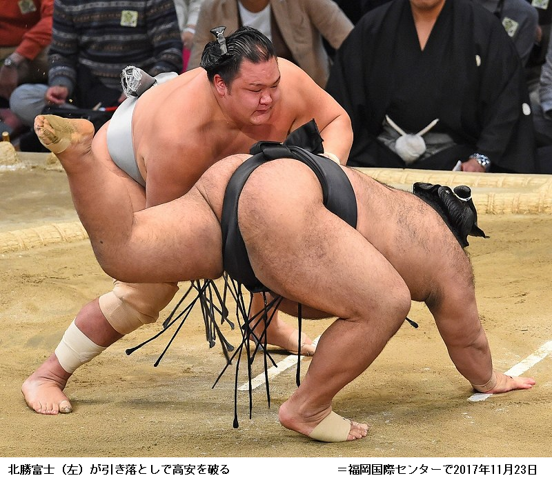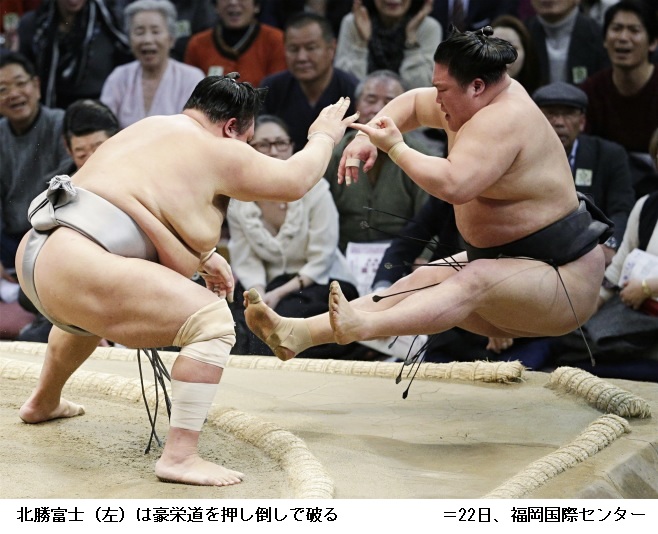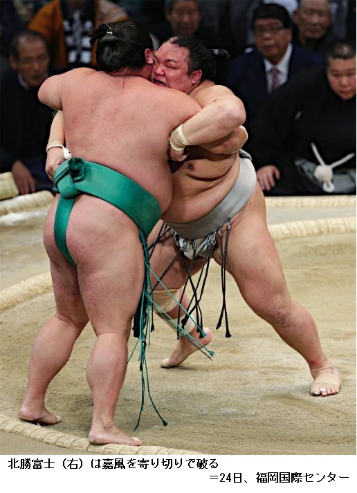 同じく2敗を守った北勝富士は対戦した嘉風にいったん有利な形を作られた相撲を振り返り「危ない内容だった。前傾の姿勢を崩さず、相手が引いたときに突き押しができた。よく勝てたと思う」と話しました。