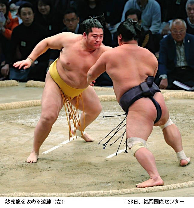 正代に妙義龍は妙義龍が左ひざのけがで25日から休場のため、正代の不戦勝です。正代は勝ち越しです。