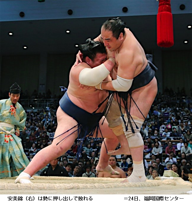 安美錦に大栄翔は大栄翔が押し出し。39歳のベテラン、安美錦は今場所初めての連敗で3敗目です。