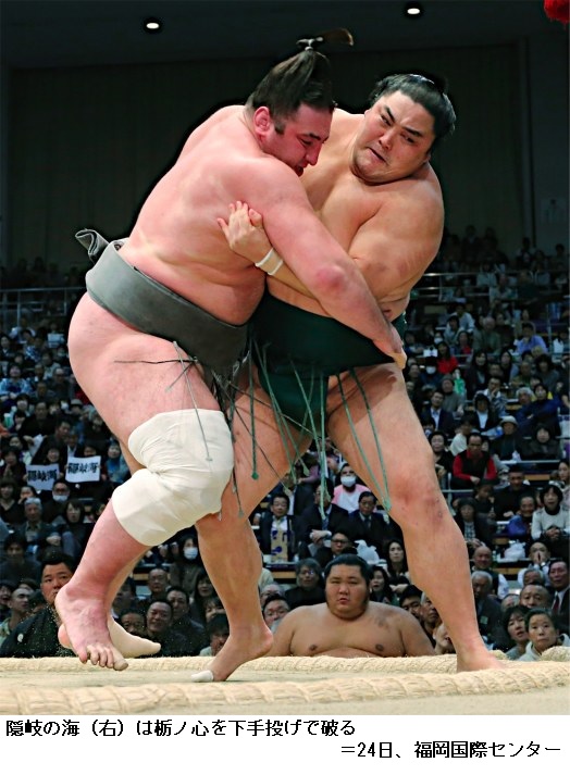 隠岐の海に栃ノ心は、隠岐の海が下手投げ。隠岐の海は2敗を守りました。