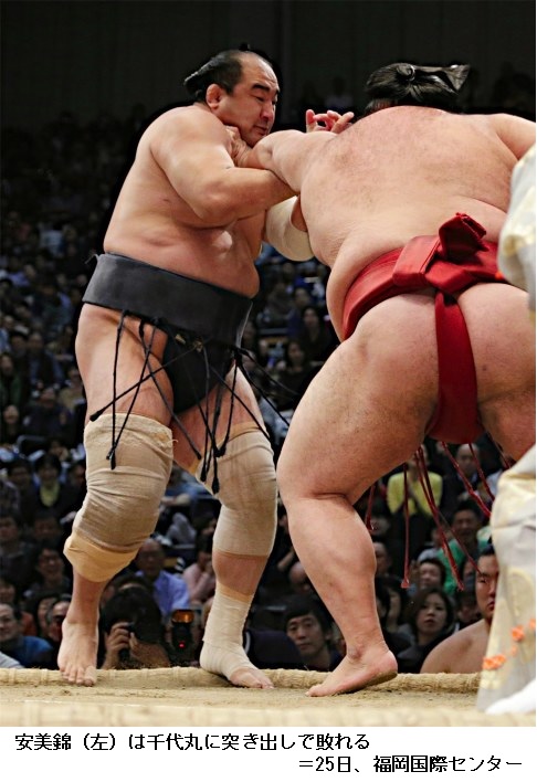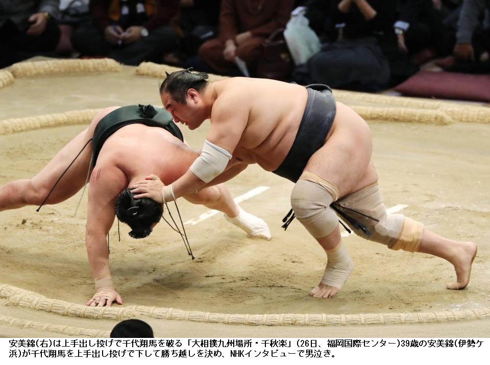 千代翔馬に安美錦は、安美錦が上手出し投げ。史上最年長、39歳で幕内に復帰していた安美錦は、連敗を4で止めて勝ち越しを決めました。千代翔馬は負け越しです。