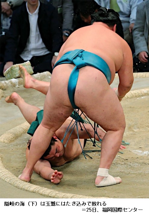 隠岐の海に玉鷲は玉鷲がはたき込み。隠岐の海は3敗目、玉鷲は10勝目です。