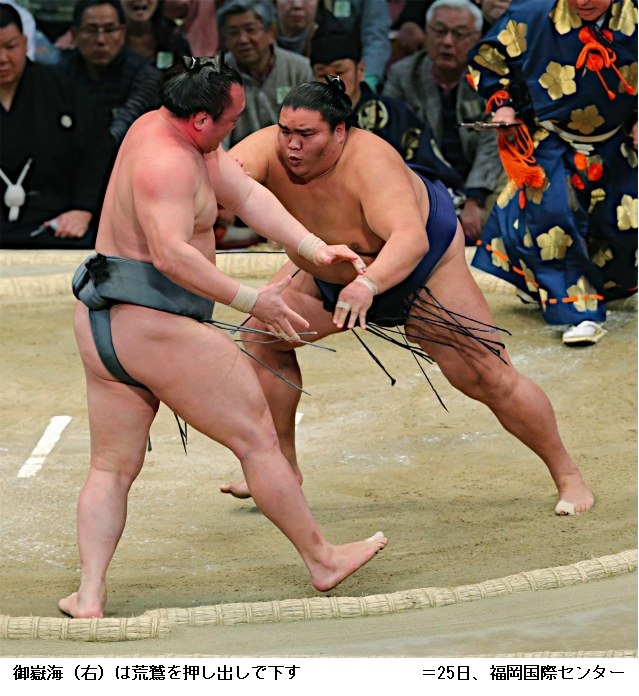荒鷲に御嶽海は御嶽海が押し出しで勝ちました。御嶽海は勝ち越しを決めました。
