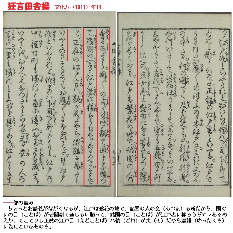 江戸語を京阪語と比べてみた場合はどうでしょうか。江戸後期に数多く出てきた地方語の語彙集がほとんど例外なしに地方語と江戸語を並記していますように、江戸語が実質的には共通語として学ばれ意識されてきたわけです。三馬の「浮世風呂」で