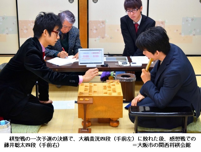 藤井四段、2次予選進出逃す 棋聖戦で大橋四段に敗退 ―― 公式戦29連勝の新記録をつくった将棋の中学生棋士、藤井聡太(そうた)四段(15)が29日、八つあるタイトル戦の一つ、棋聖戦(産経新聞社主催)の1次予選の決勝で大橋貴洸(たかひろ)四段(25)に100手で敗れ、2次予選進出を逃した。