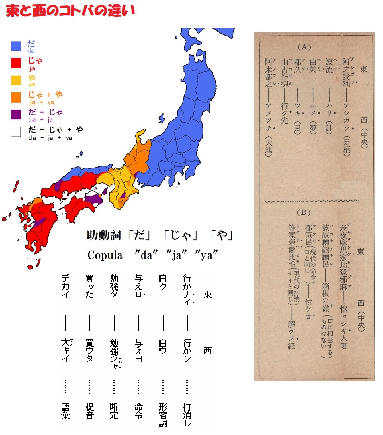 現代でも上の図版のように、対立していますが、対立は上代まで遡って考えられます。まるで別系のコトバのようです。平安時代の始めの頃と考えられる『東大寺諷誦文(ふじゅもん)考』に「東国方言」の名が見えることや『万葉集』に「東歌」が載せられていることから東の方言が西(中央)に対立するものして考えられていたことが判ります。