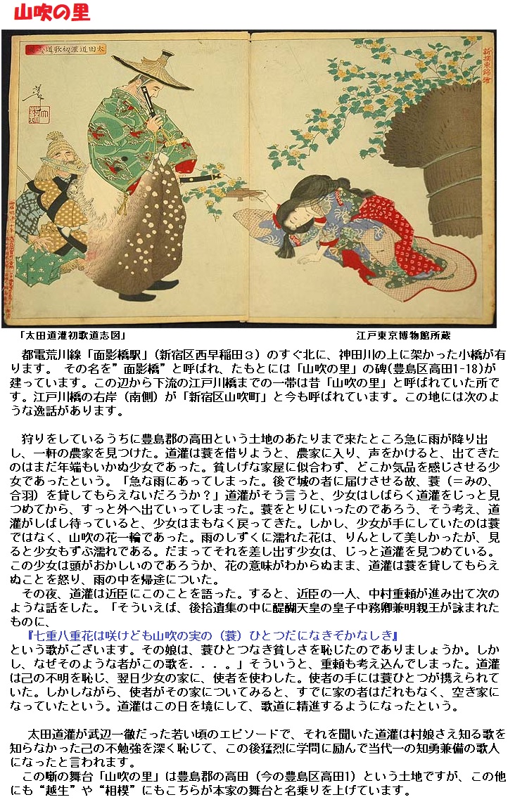 太田道灌が今の皇居辺りに城を築いたのは康正三年(長禄元年・1457年)であり、山吹の一枝にまつわる武将と田舎少女とのロマンスは東京の出発語るにふさわしいエピソードです。