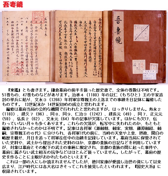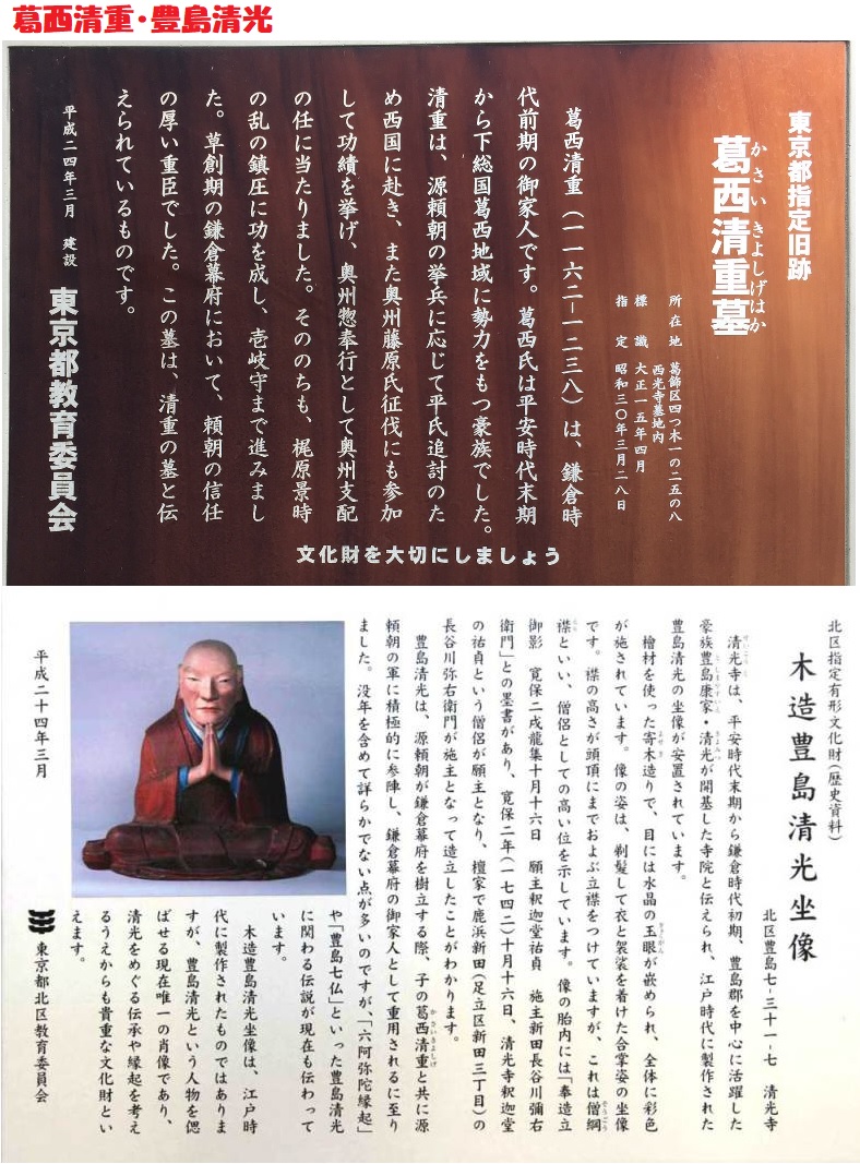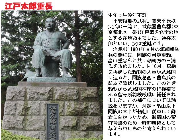 しかし、東京の前身である江戸が歴史に現れるのは、これよりさらに300年も遡った治承4(1180)年9月の『吾妻鏡』の記事、「江戸太郎重長ニ仰付ラルルナリ」です。以後江戸の名が諸文書に見えますが、他にも葛西清重(今の葛飾区)・豊島清光(今の豊島園付近)の名が見えます。地名や人名からいうと、東京は江戸氏を以って約800年以上の古い歴史ということになります。