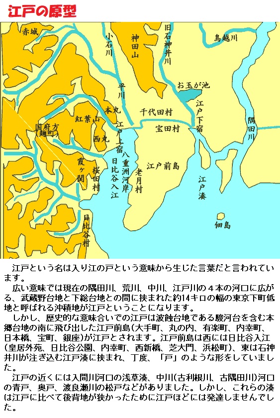エドは入江深く海から入り、川が海に注ぐところで江口・江尻などの江と同じく、入江の江と考えられています。戸は水戸や松戸などの戸と同じく所とか里とか入口のトであると思われます。ただ地形的名称ならば、かなり早くから命名されていたと思われますが、比較的新しいので、その点この説も疑問のあるところです。