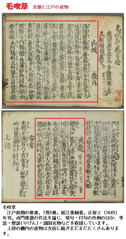図版の下の図では武蔵はすべてを挙げてありますが、京都(畿内)の産物は初めの部分のみで後七・八ページは続きます。京都は薬や白粉をはじめ酒類から遊び道具まで何一つ整わぬものはない有様です。南蛮渡りの酒や菓子まである文化生活に明け暮れている様子です。