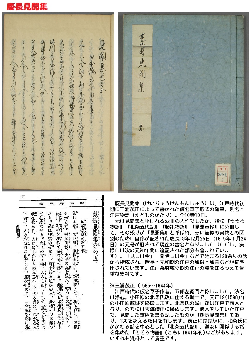 『慶長見聞集』に、日本橋の繁華ぶりが目覚ましいものであると記述している反面、江戸近辺神田の原より板橋まで見渡すと、竹木は一本もなく全くの野原だったと描いています。