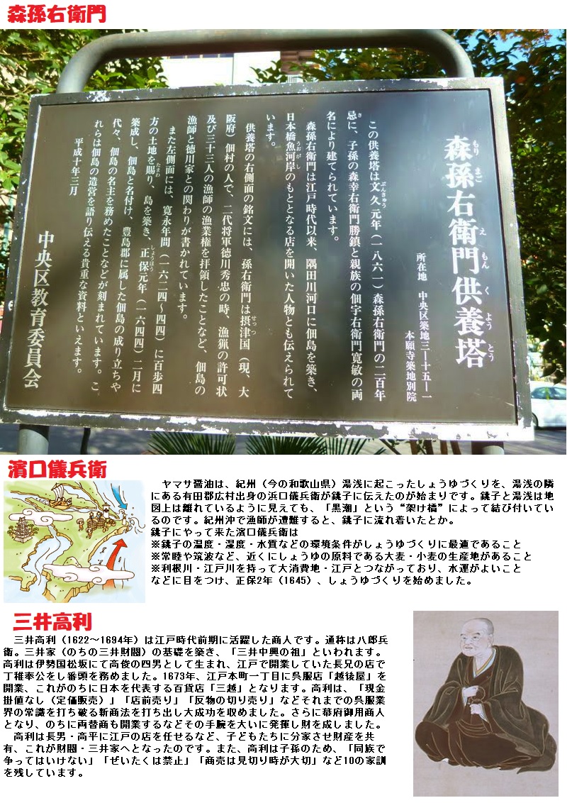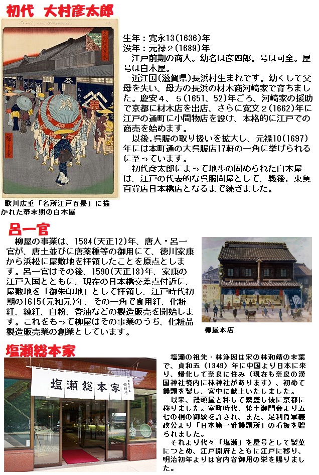 同じくデパートの白木屋の操業も古く、その祖は近江長浜の人といいます。堅実型として名の高い近江商人の出てす。その他ポマードで名高い柳屋も、その祖・呂一官(中国人)が家康とともに江戸に入り、饅頭の塩瀬(中国人)も同時でした。