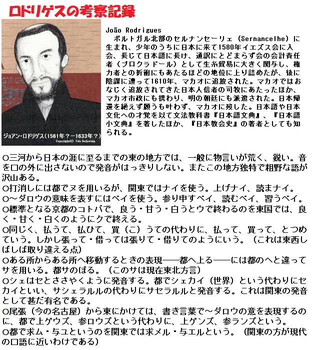 初期の江戸ではどのようなコトバが実際には話されていたのでしょう。人間構成から想像されるように土地としては東国方言と上方語が同居し、街の性格としては、武士と町人のコトバが通語として話されていたことでしょう。もっとも単に一地方のイナカコトバにすぎなかった江戸近辺のコトバ(以下江戸方言と呼びます)が急に文献に書き留められ、書物になって出版されるはずもありません。あいかわらず、上方語が標準語であり、本流でした。しかし、単に傍流に過ぎず、エビスコトバと卑下された東国方言こそやがては日本のコトバになる運命を授けられていたのです。これは広く日本語の歴史において空前絶後の大事件といってもよいのではないのでしょうか。幸いにしてこの初期の江戸方言とほぼ同質的なものが、異国の熱烈なクリスチャン、João Rodrigues(ジョアン・ロドリゲス)によって、次のように考察記録されています。