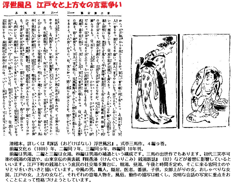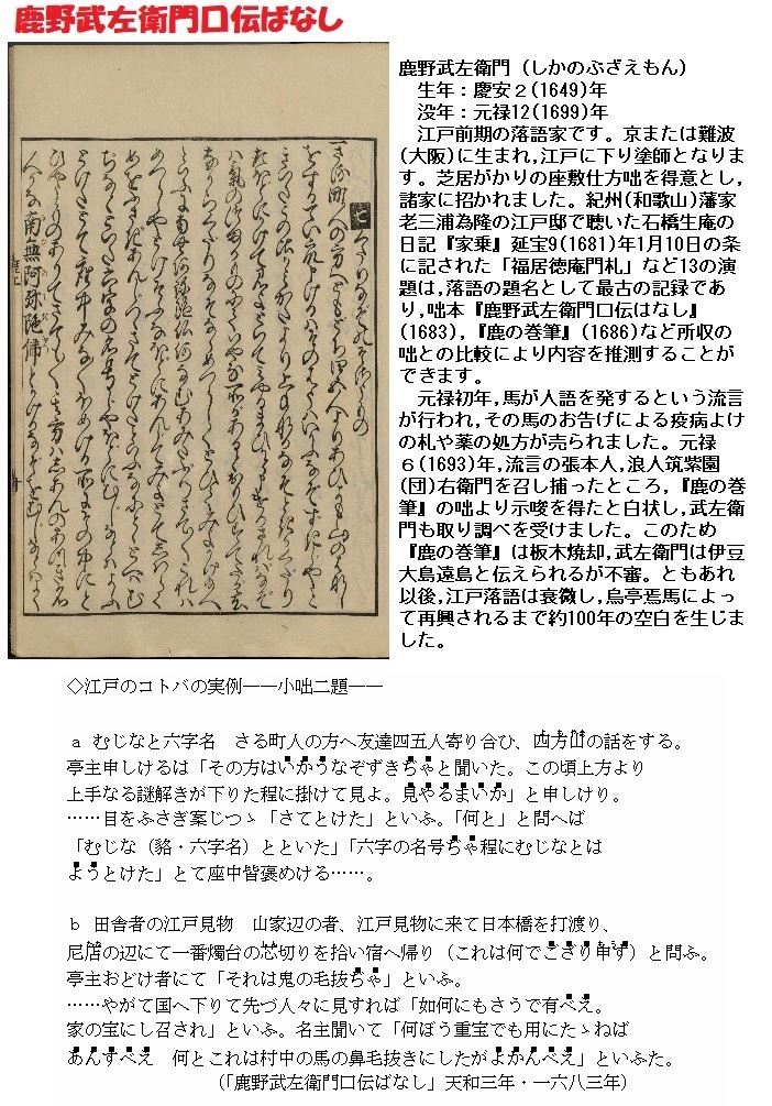 上の図版のa bは江戸落語の祖となった咄本から引用したものですが、aの●印は明らかに上方語です。関東ではダとかヨクとか言うのです。この他〈……しゃる・……さかいに・いうた〉などもごく普通にみえます。ただ、bで山家の者がベイを用いているところは注意されます。ほかの話にもやはりベイが見えますが、その他に〈ワグレ(お前)・デカバチナイ(大きい)・ツボッコイ(可愛いゝ)・ウッポレタ(とても惚れた)〉などの関東方言が見られます。こうした方言は現在でも関東地方や東北地方の方言の中に見出すことが出来るのです。概して江戸の中心部より遠い人々に現代から見て方言的なコトバを使わせている点は見逃せません。これは一面元禄の頃には関東方言の一部が府外に排除されて、江戸府内のコトバが独自なものとして創造されてきたことを物語るものでしょう。